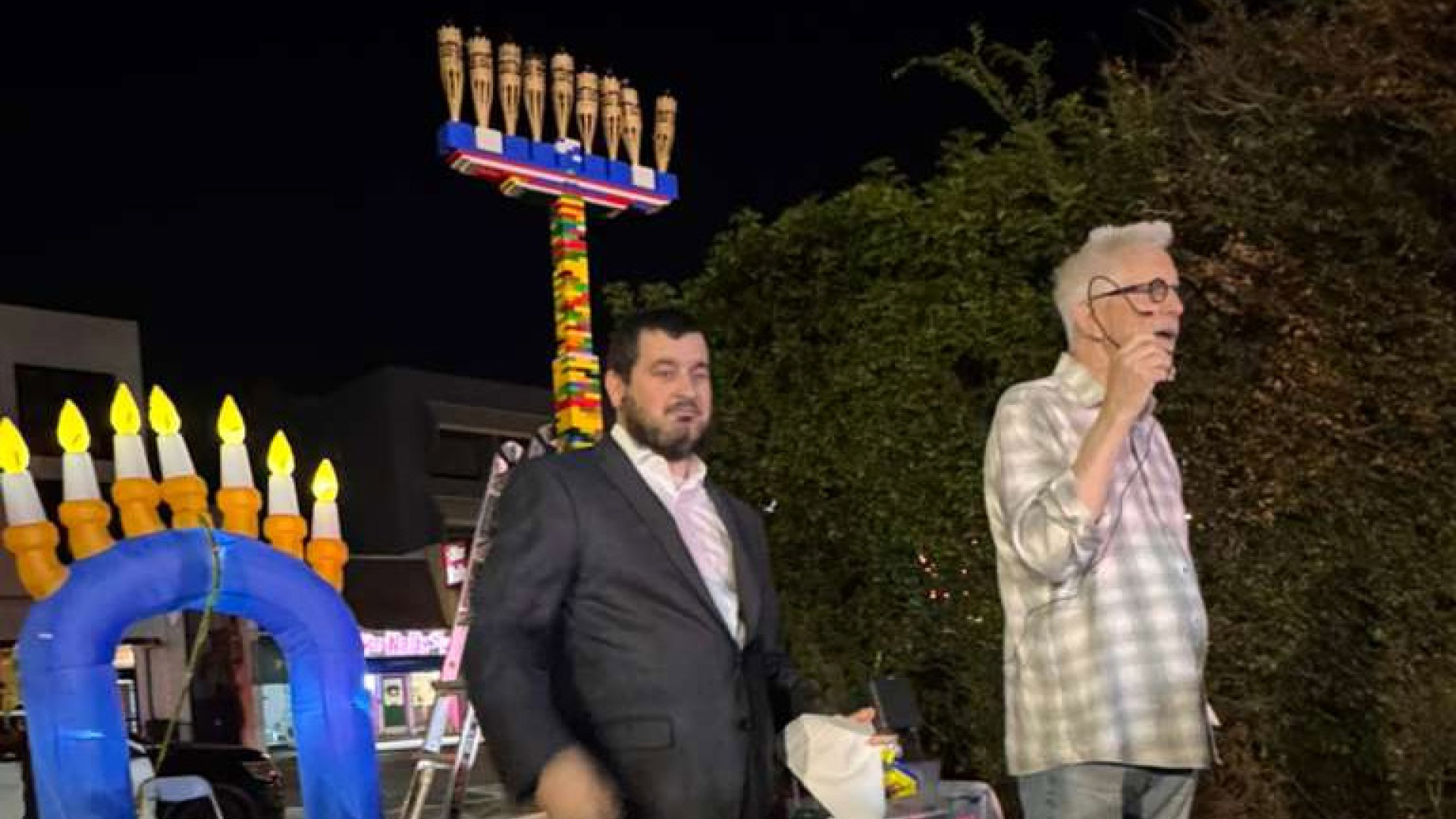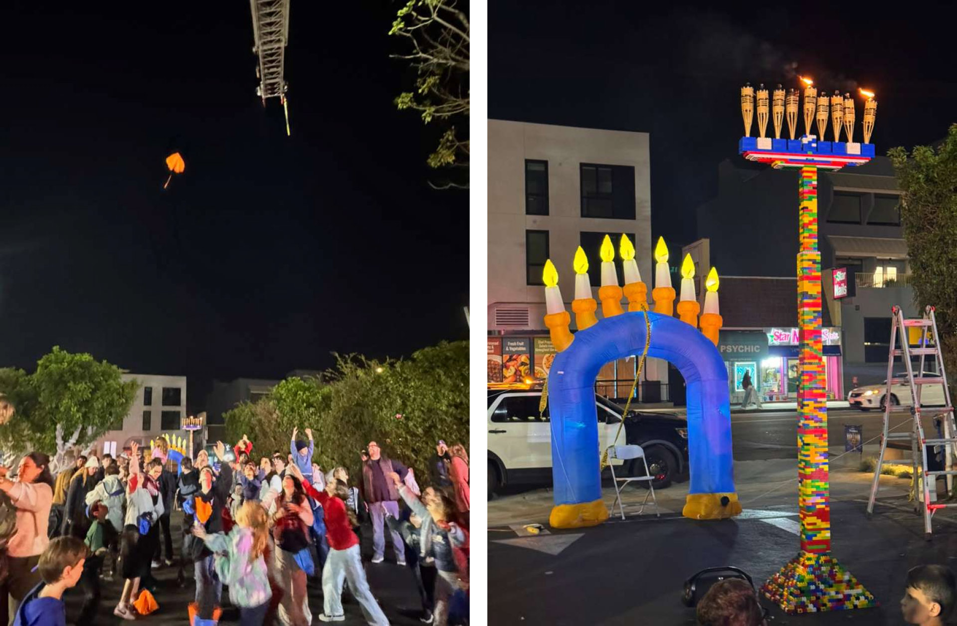 The evening brightened spirits with live entertainment, warm latkes, doughnuts and other refreshments, hands-on children’s activities — including a new build-your-own Lego dreidel station — the signature fire truck gelt drop and the lighting of a giant Lego menorah with special guest Fritz Coleman.